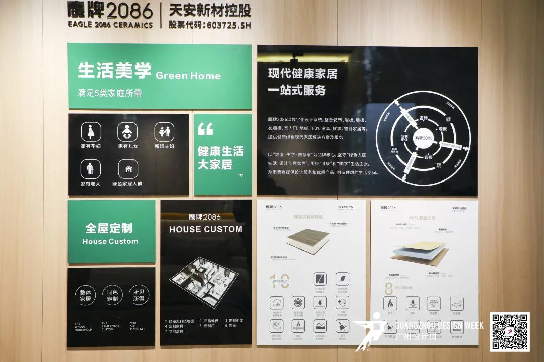 本次广州设计周,瓷砖与高端健康新材料的结合,是健康与艺术的碰撞,也是鹰牌2086积极打造“WELL健康美学生活”的开始。鹰牌2086依托天安新材技术优势,为“整装高定”战略配套打造的“装配式墙板”“HPL石晶地板”新材料产品正式对外公开,同时,鹰牌2086「墨韵」系列、「和」系列瓷砖新品也在设计周现场首次亮相。