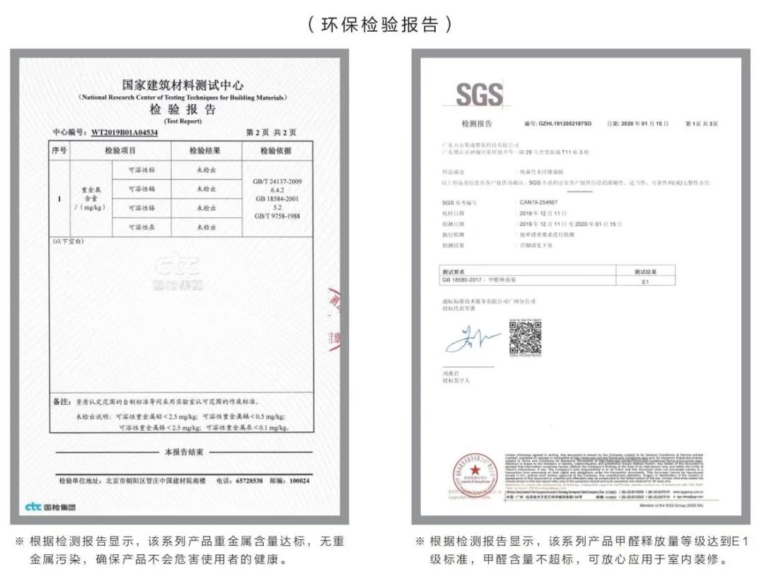 根据权威SGS检测报告显示,鹰牌2086装配式墙板产品甲醛释放量等级达到E1级标准(国家最高标准),无甲醛、苯等有害物质释