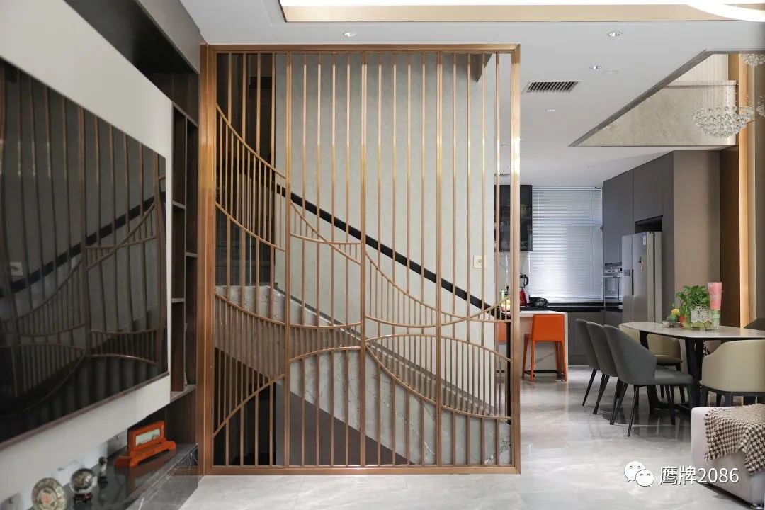 一层是集客厅、餐厅、厨房与一体的开放式空间,整体以现代轻奢风格为基调,金属感线条融入营造暖色调氛围,阳光照进屋子的时候,明亮且温馨。