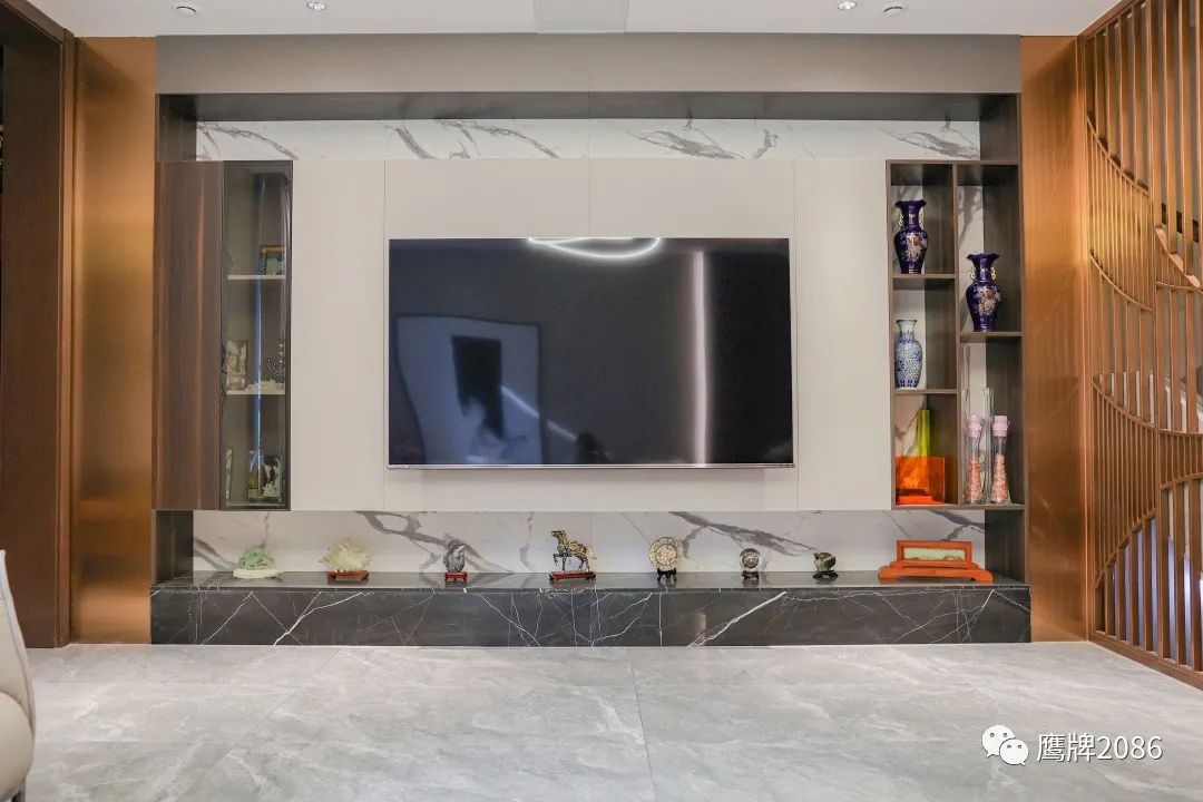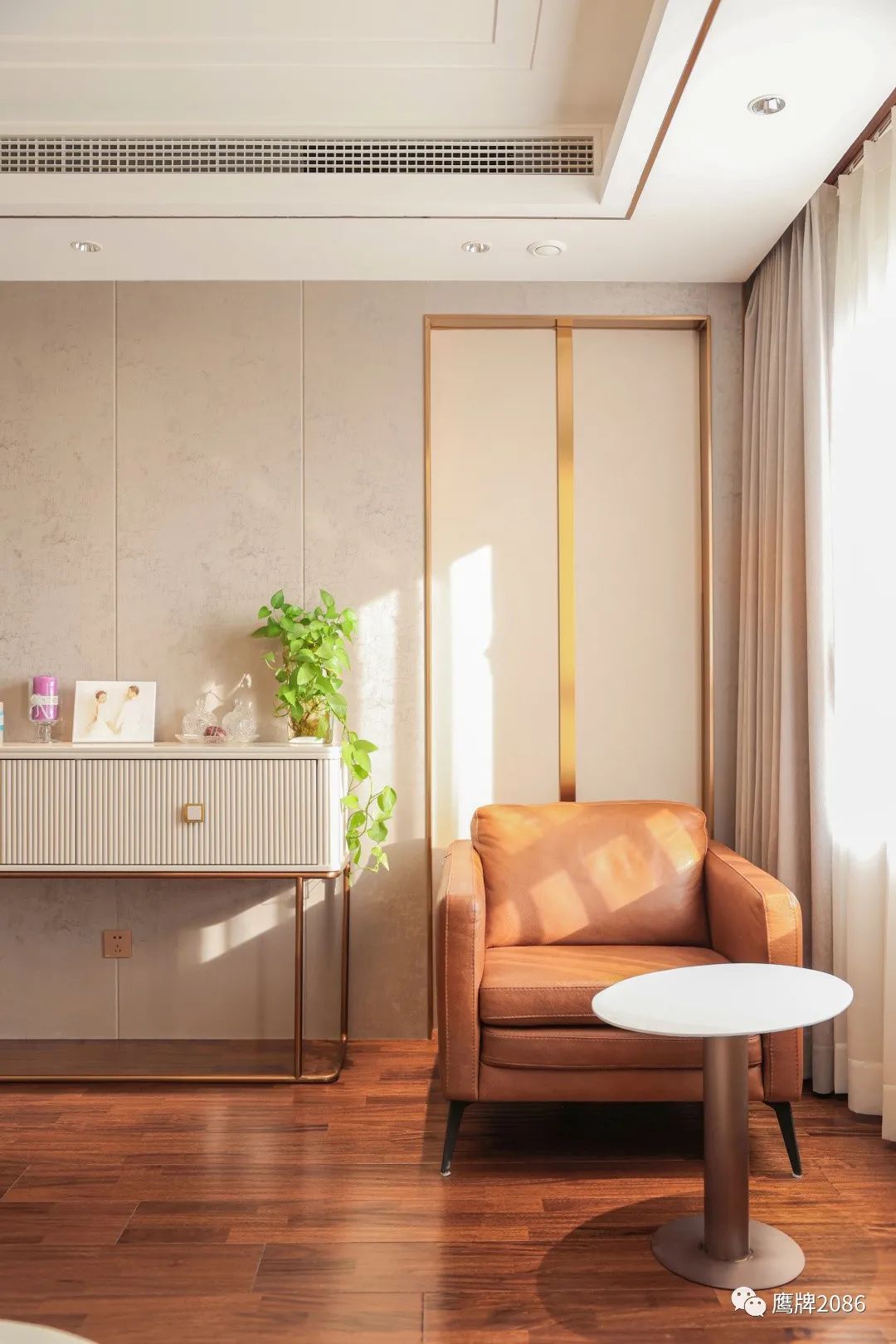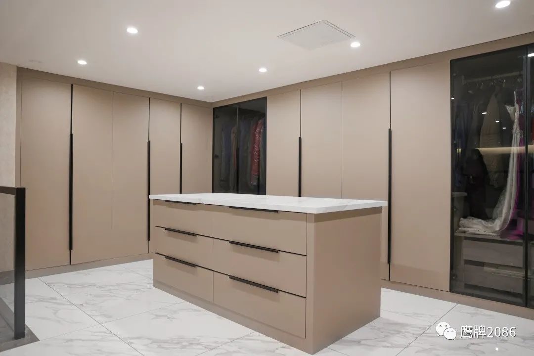 负一层是半层架空结构,主人利用这个空间设计了一个衣帽间,自然原木色定制柜体,地面选用白色系「女神」系列,整体空间简约又时尚,打造一个华丽变身的理想空间。