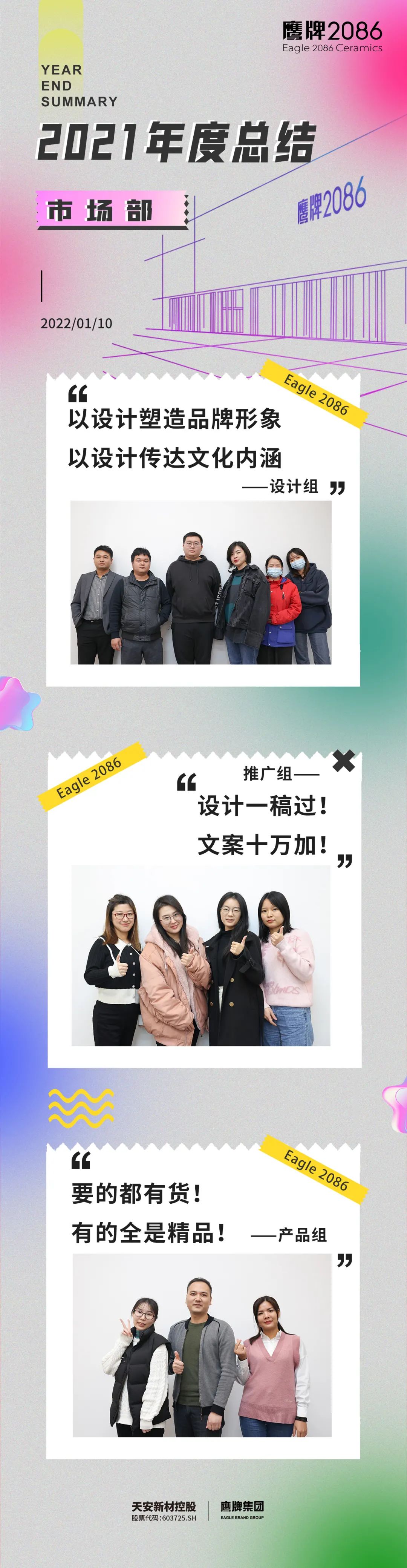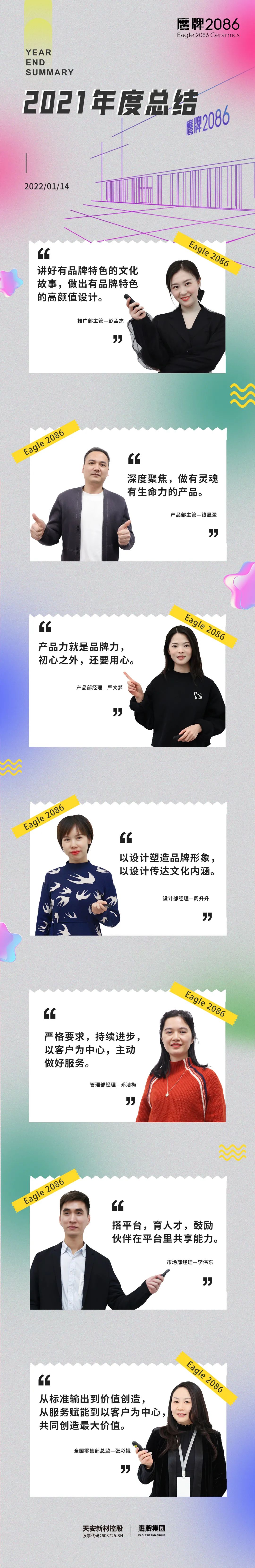 “除了运营管理的成绩,我们还有品牌发展道路上的一些成果。今年,品牌推广部紧紧围绕空间、设计、美学、文化、生活的维度来构建品牌认知度和影响力;设计部从设计源头引导产品,达成品牌特征、渠道特征、区域特征与产品结构的完整输出;产品部在库存把控和新品开发上的助力让鹰牌2086产品体系更聚焦更完善。种种的工作成绩汇集成了鹰牌2086一个又一个里程碑。”