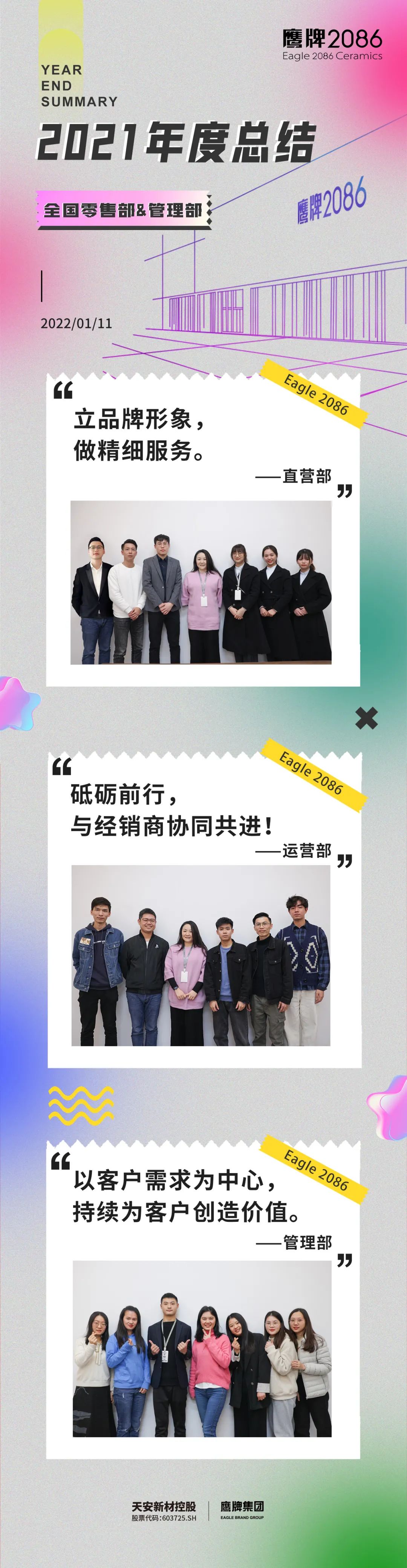 2022年1月10日-15日,瓷砖一线品牌鹰牌2086营销中心顺利开展了2021年度工作总结及2022年工作规划大会,销售、管理、市场、运营等多个部门全员就位,持续了一场为期6天的会议,通过不断的总结复盘,展现2021年各部门取得的成绩和亮点,同时也为2022年的工作做好了全面的计划。