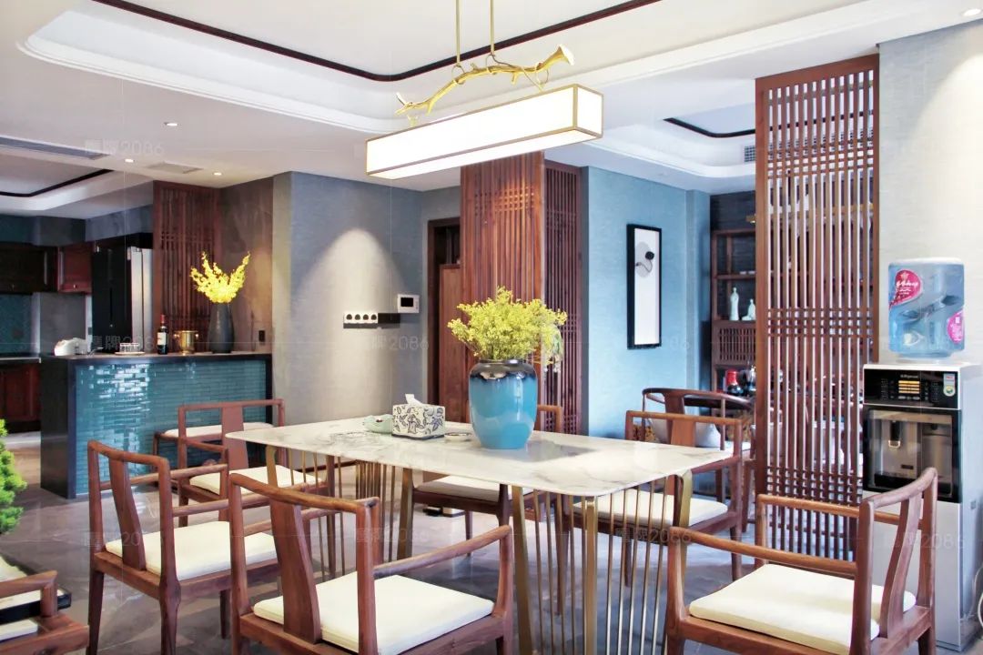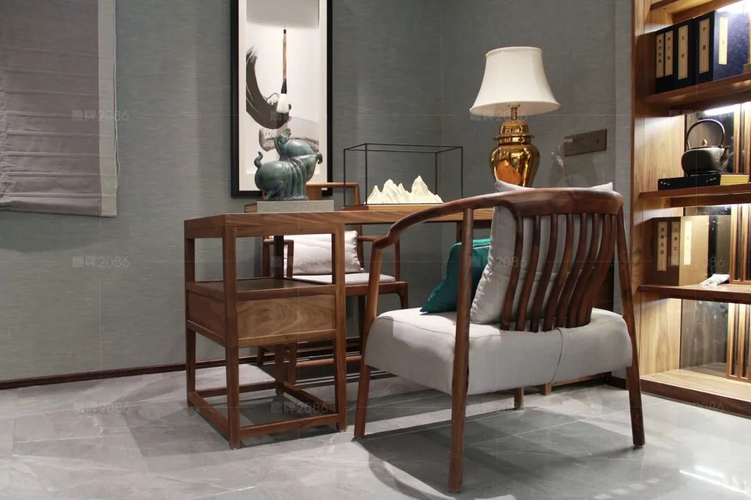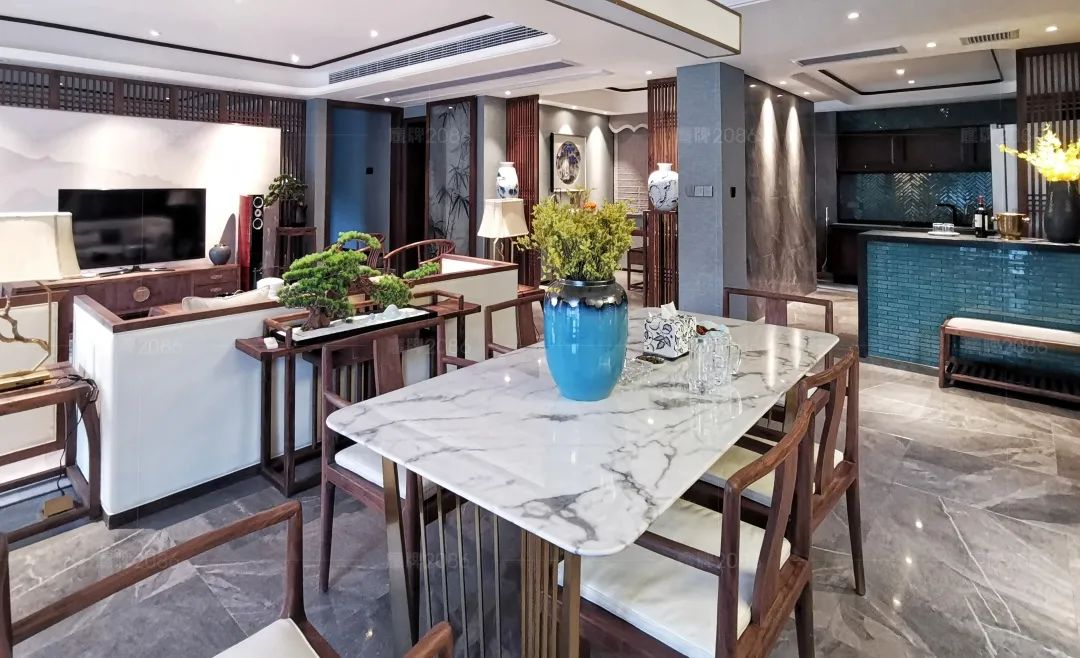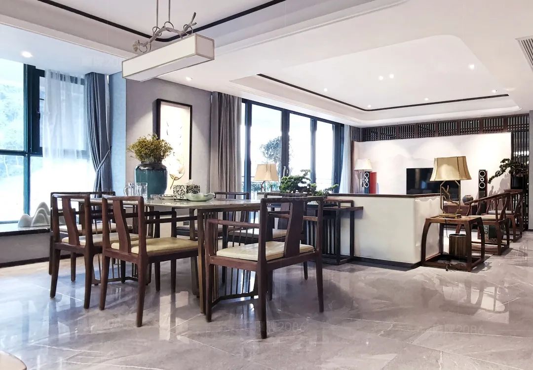 客餐厅一体式设计,使整体空间更开阔大气,瓷砖十大品牌鹰牌2086高级百搭的灰色柔光地砖,与精细考究的现代中式家具相映成趣。