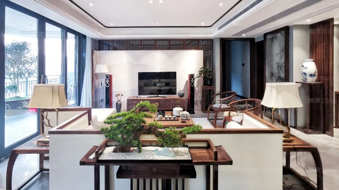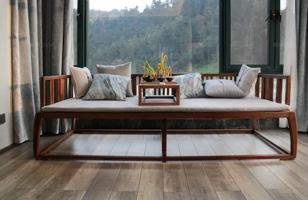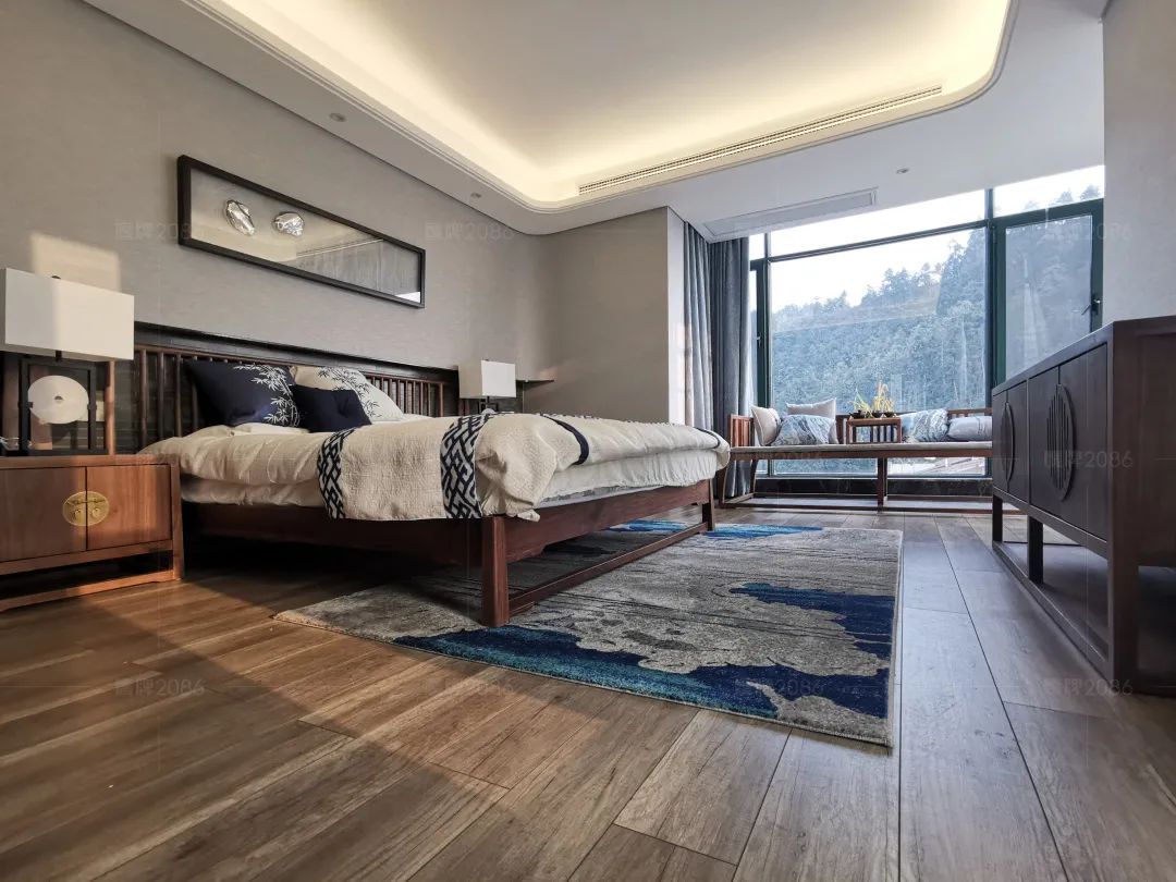 充满新中式古色古香韵味的卧室,台灯与茶几,贵妃榻与茶具兰花,窗外山峰耸立的郁郁葱葱,洒下来的温暖阳光,一切显得刚刚好。