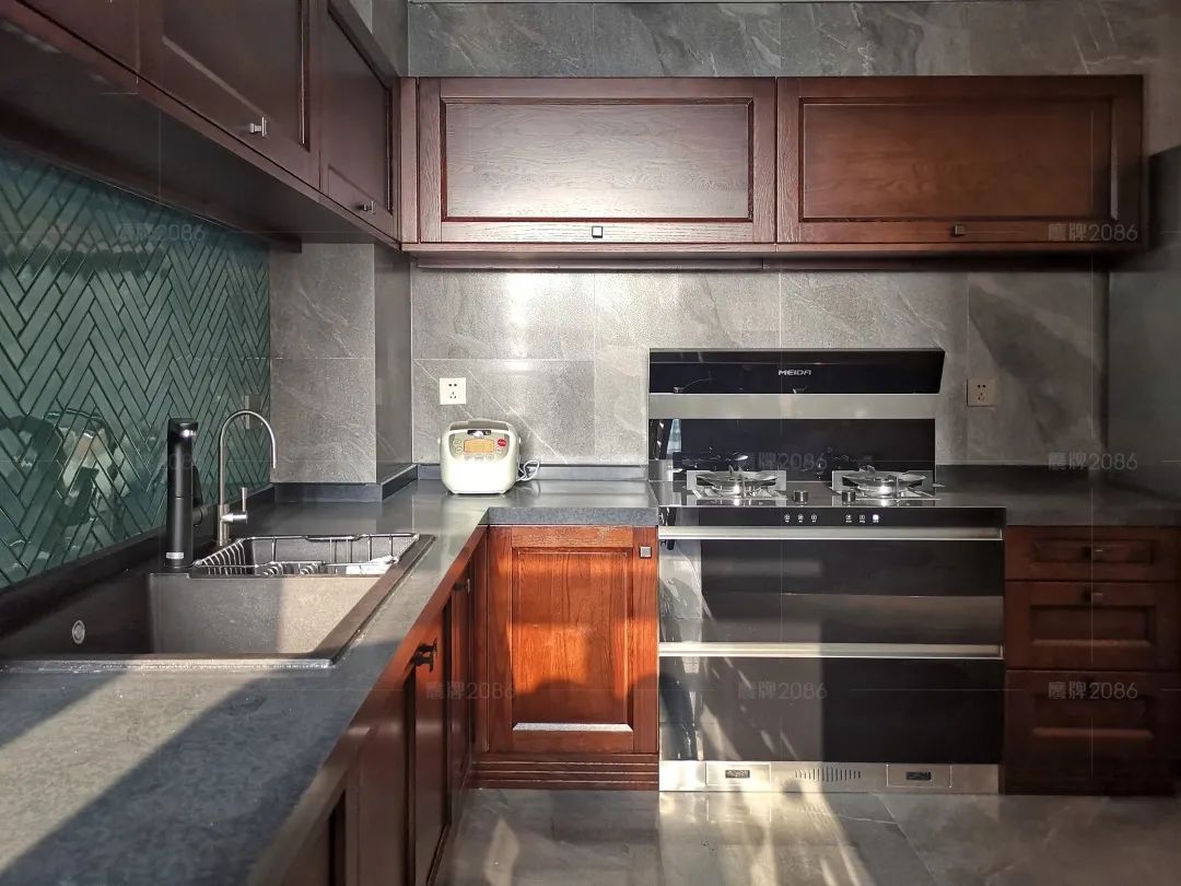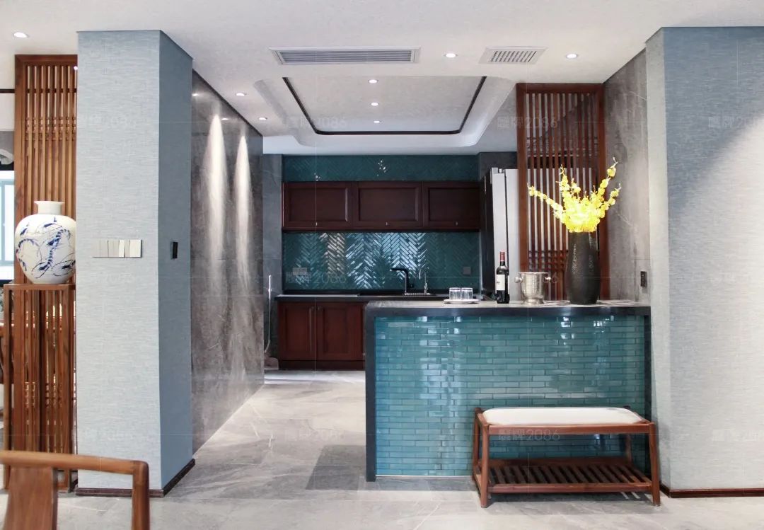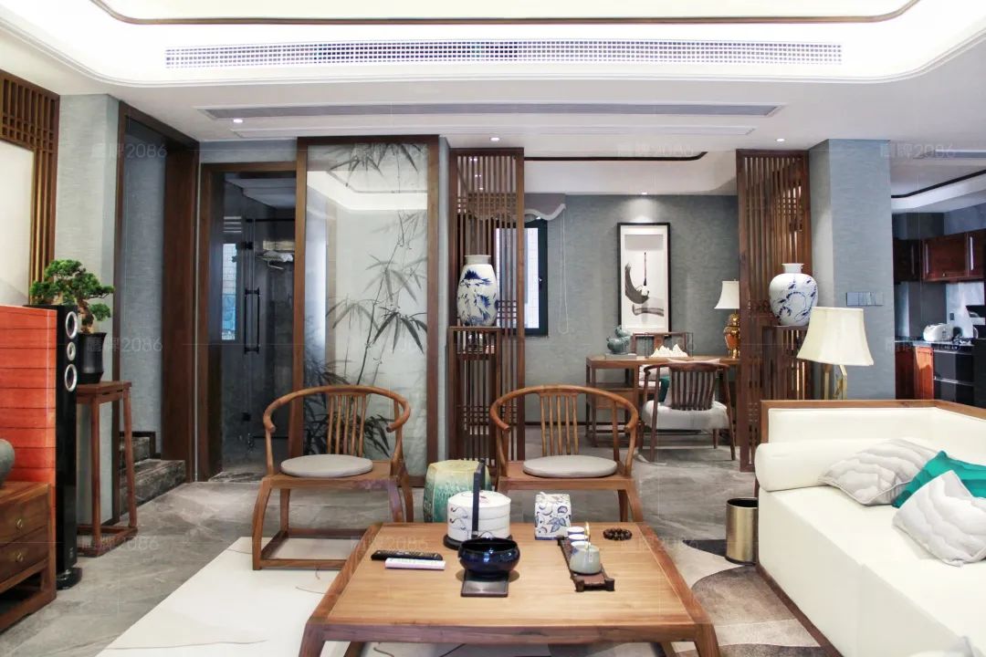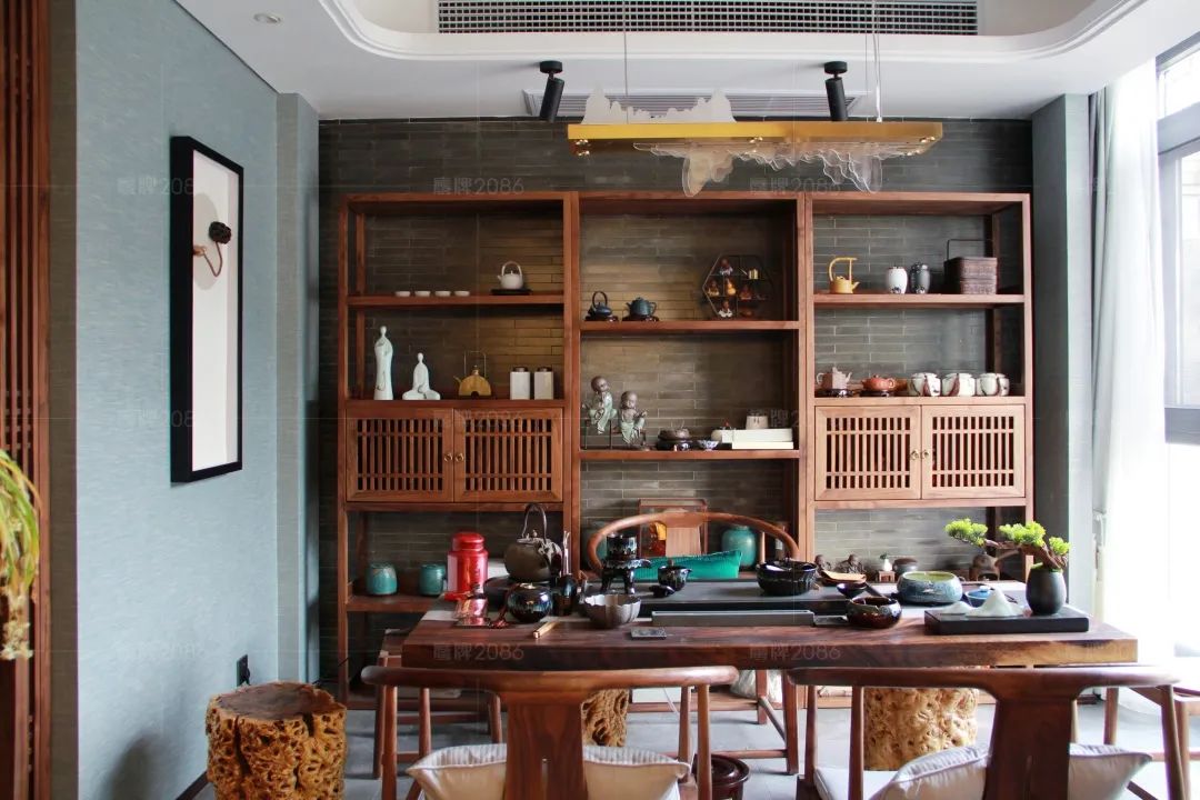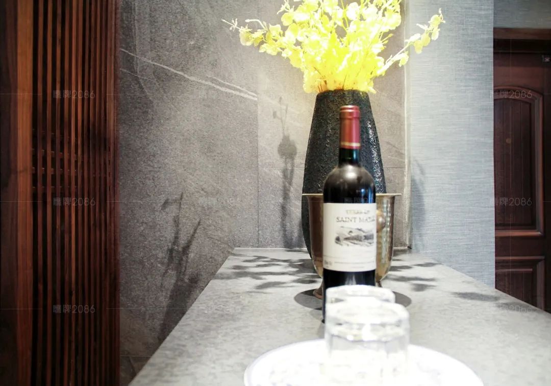 本案业主对东方文化情有独钟,摒弃常规的元素杂糅,全屋公共空间选用瓷砖一线品牌鹰牌2086「珠光