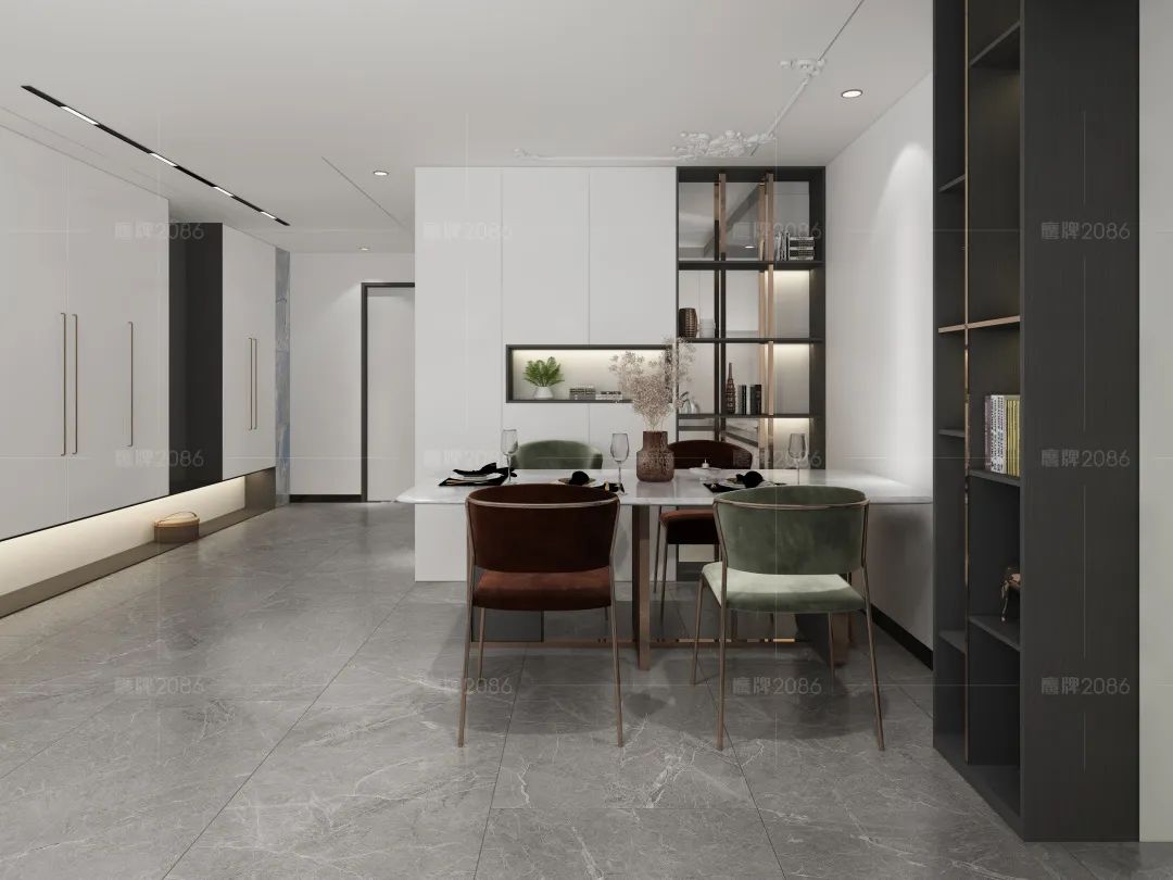 大规格暖色调奢石配合黑白灰的极简,黑色玻璃透出温馨用餐区的暖色灯光,这大概就是为家人烹饪时的幸福感受。