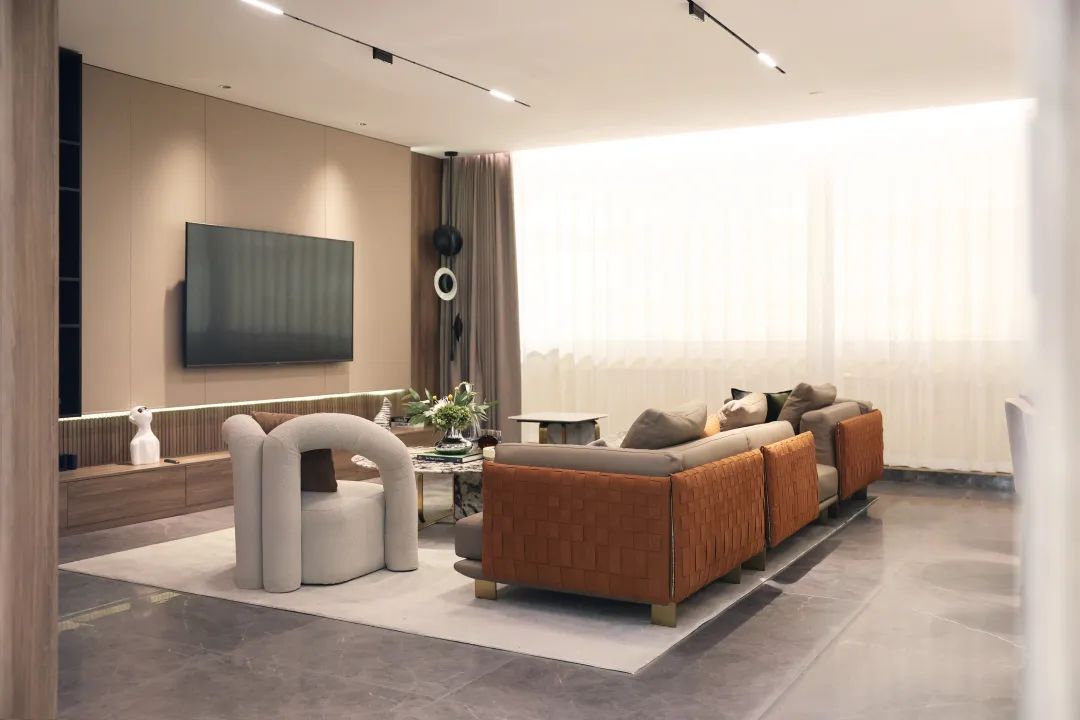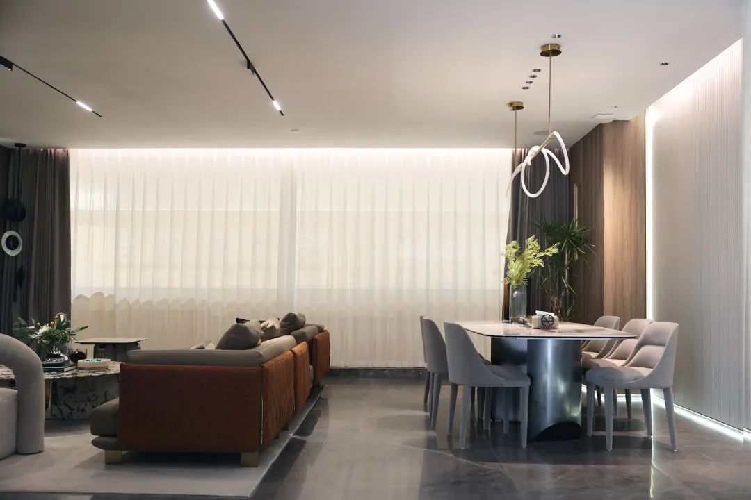 客餐厅空间整体设计简约而富有高级感,整面落地玻璃窗配上轻薄的纱帘,令客餐厅看起来宽敞明亮,柔和飘逸。整体空间选用暖人心脾的大地色系进行搭配设计,带入些许白色、木色、黑与橙的元素,呈现出美感与视觉的张力。