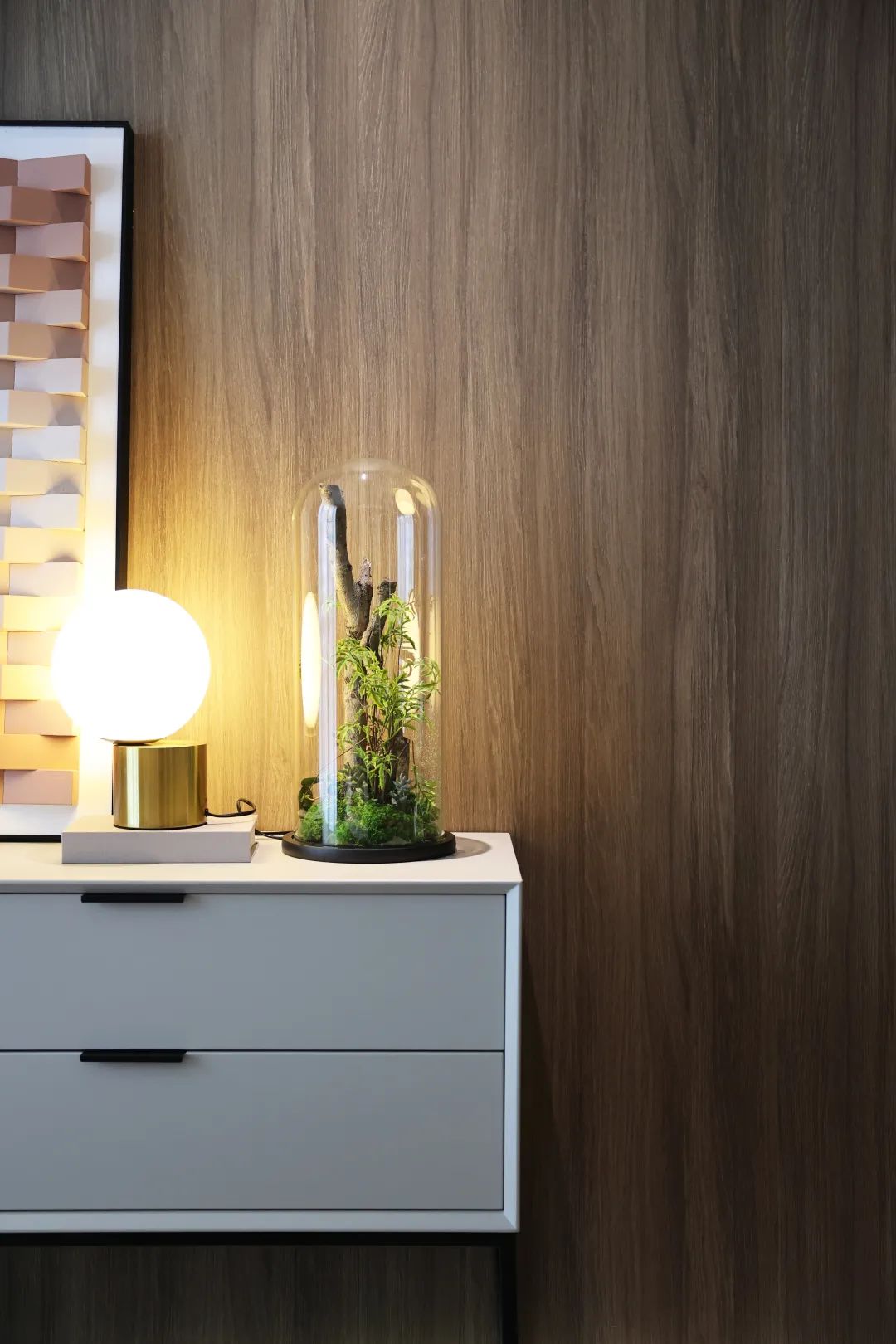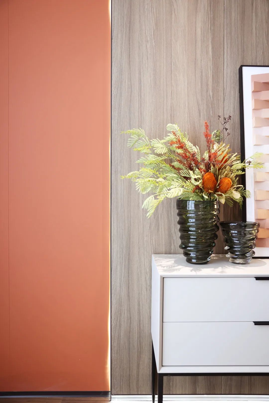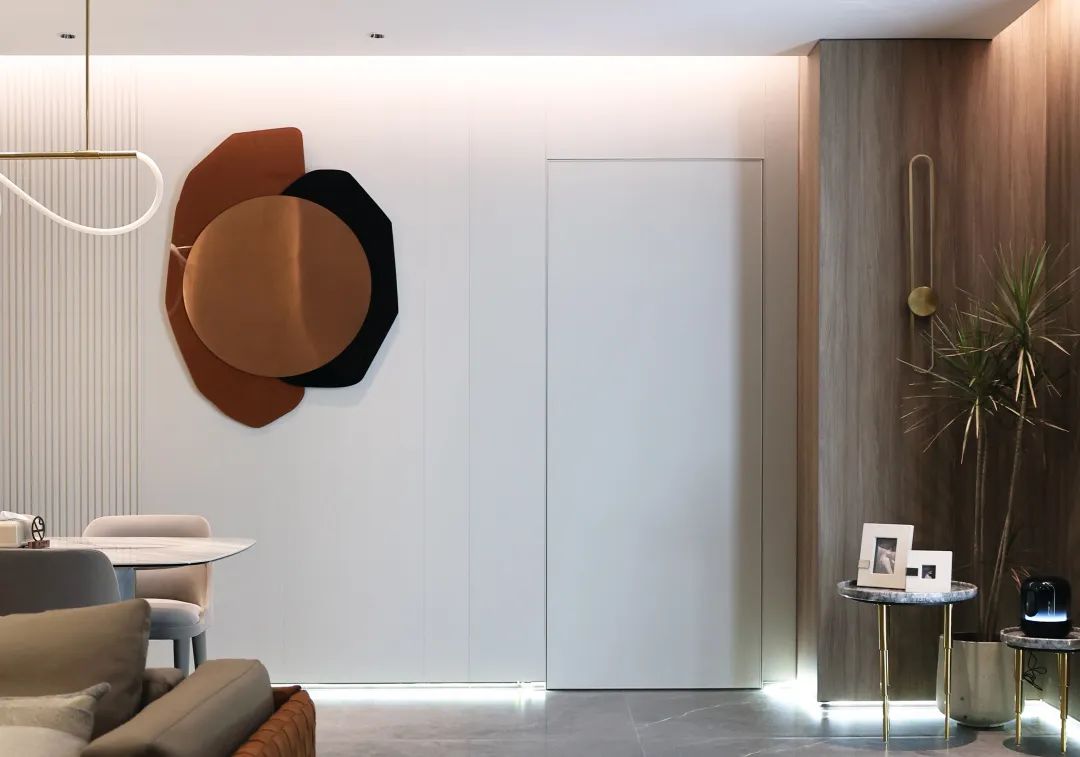 餐厅背景墙采用白色布纹结合木纹,再搭配简约的几何家居挂饰,创造出如艺廊般雅致的空间。搭配一款隐形门,使整体风格统一化。