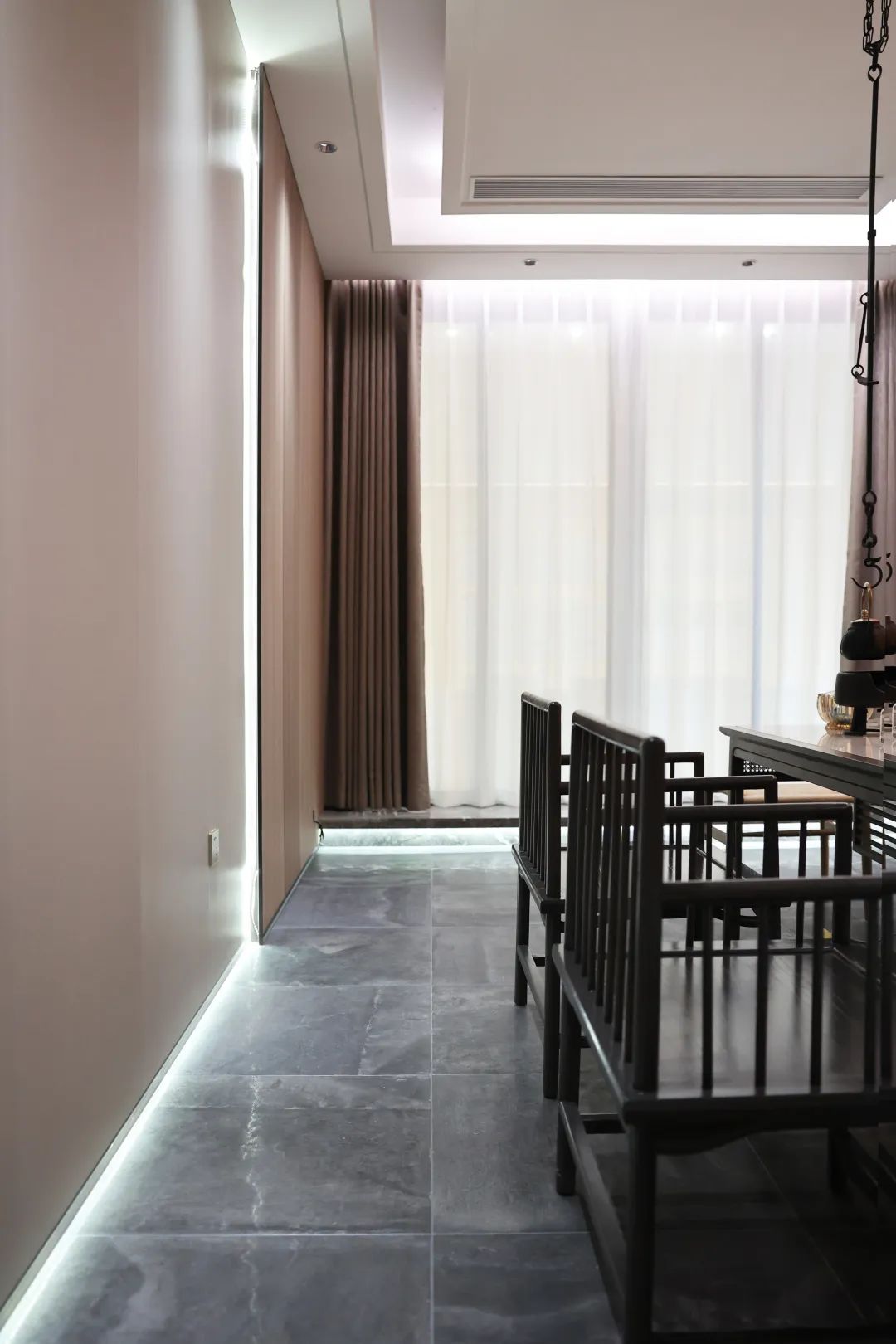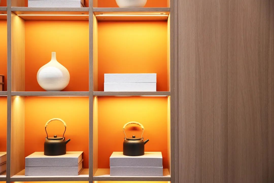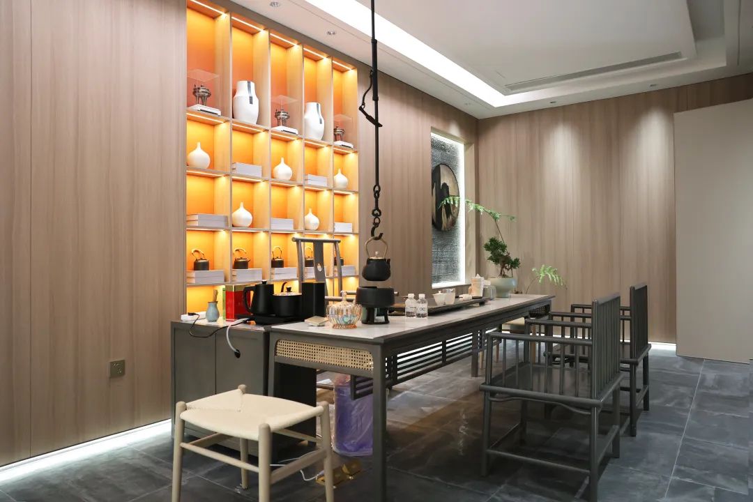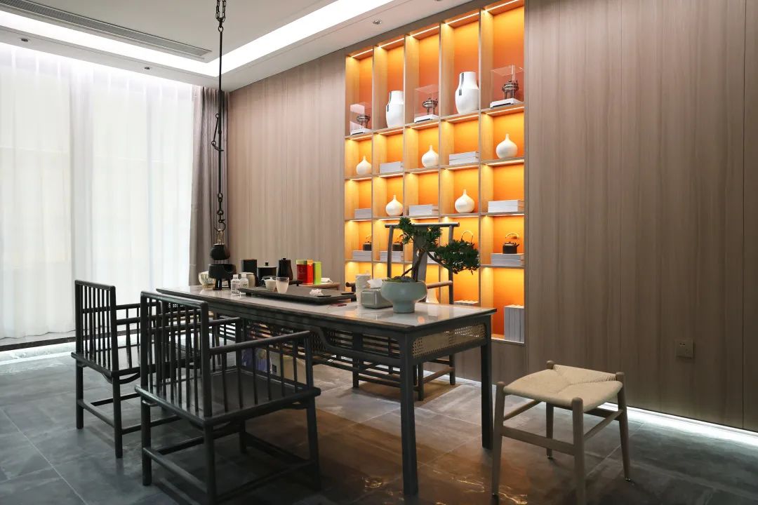茶室与餐厅仅一墙之隔,原木色的墙板搭配水墨京砖使人在安静的氛围下能更快沉淀下来。琥珀橙的开放格为整体空间增添了一些活力。在这样的室内,柔和的气息流通也是一种增加情感交流的方法。