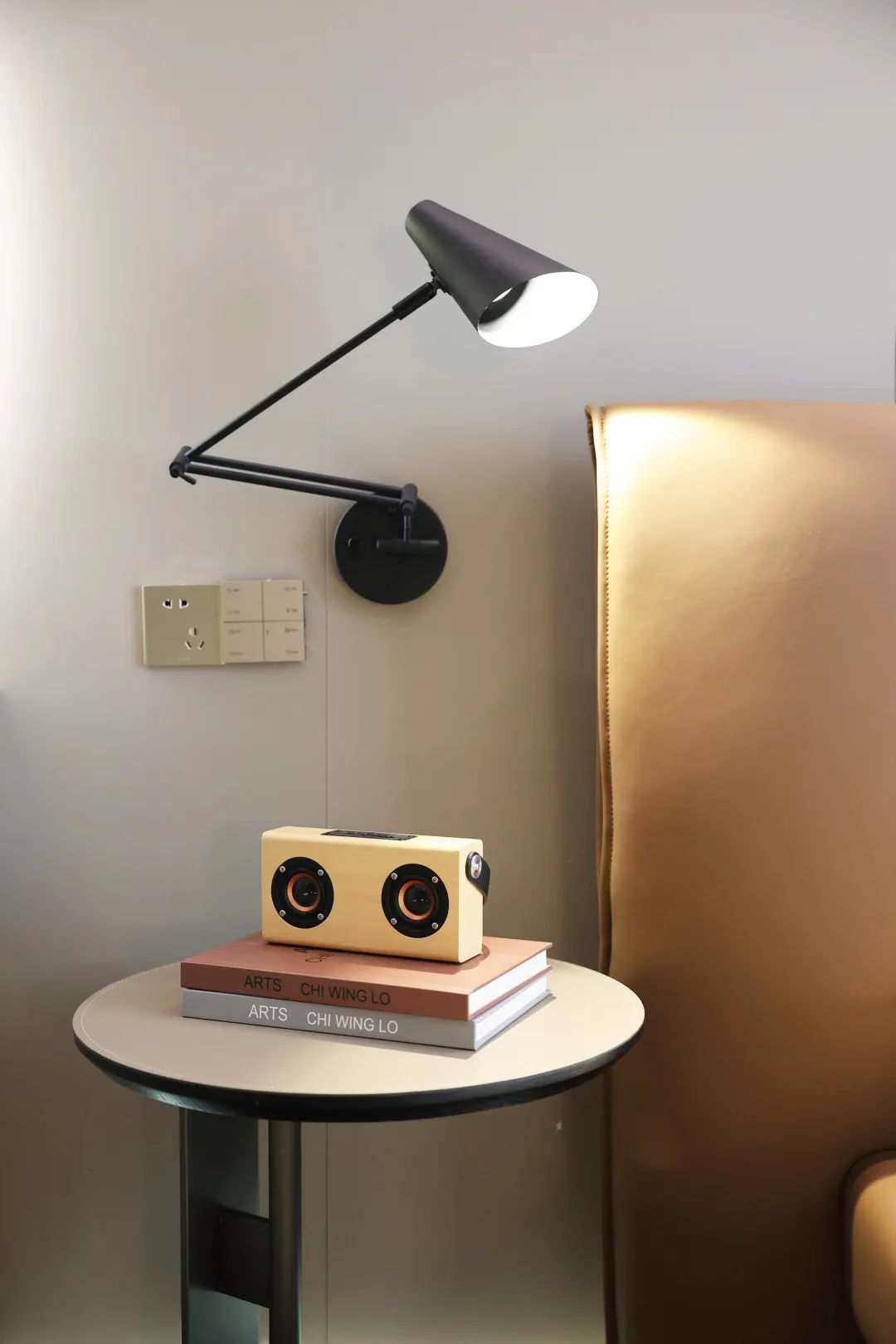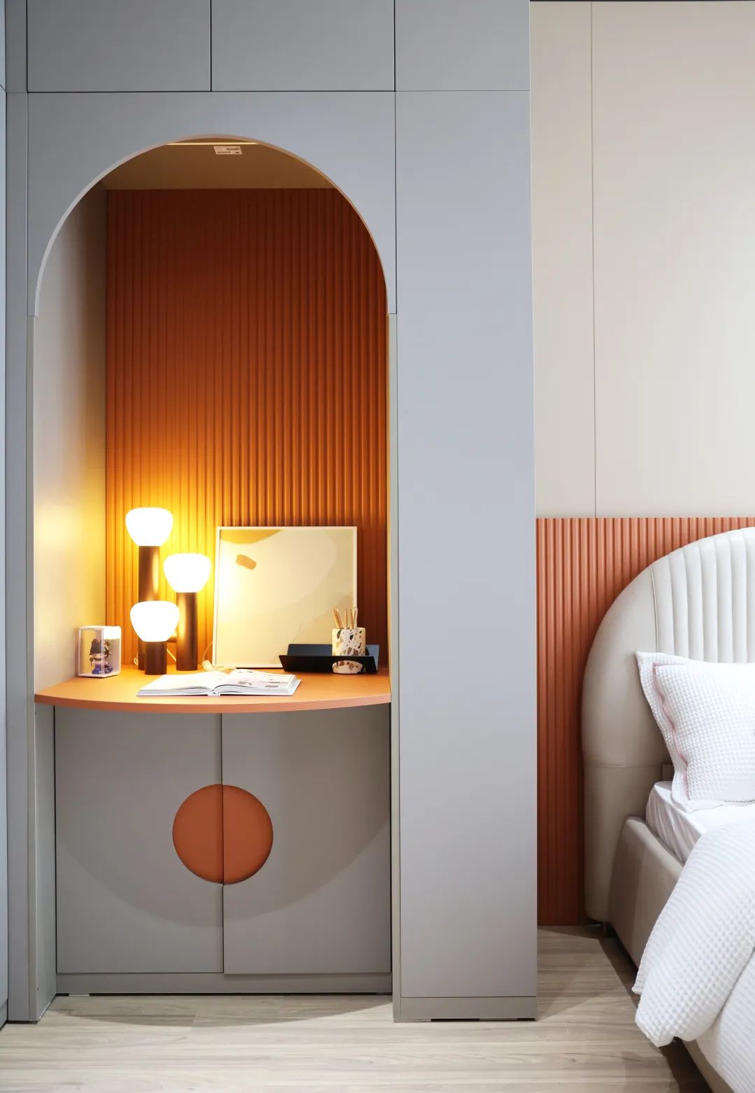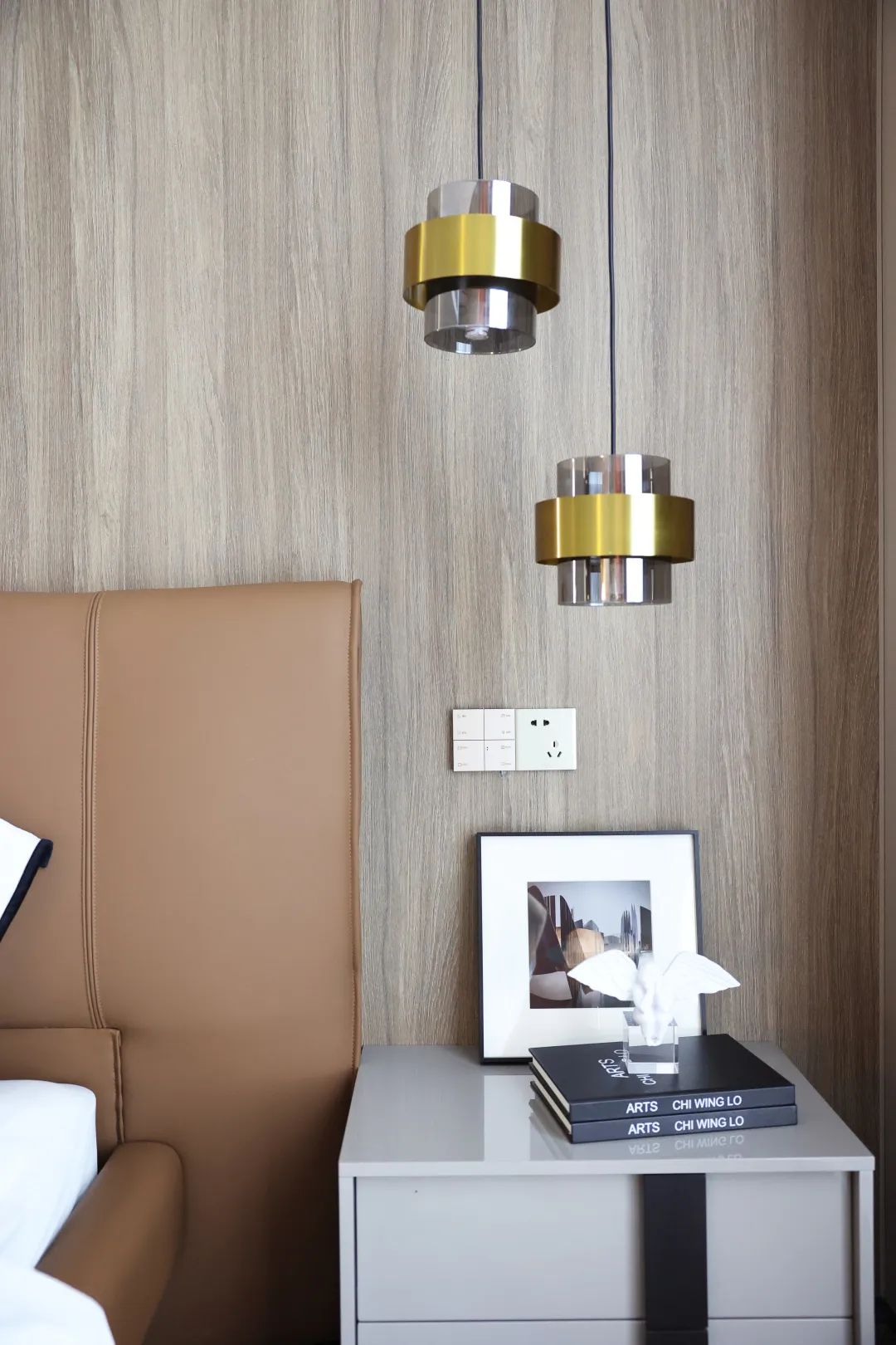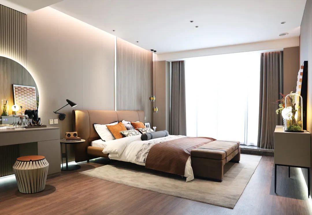 主卧空间延续客厅色彩基调,墙面使用皮革平面护墙板搭配同款长城造型板和木纹平面护墙板,不同材质肌理并存,在空间中达到巧妙的平衡。软装搭配中,以黑色和金属材质营造轻奢精致感,牵引出对精致、优雅、舒适生活的追求。