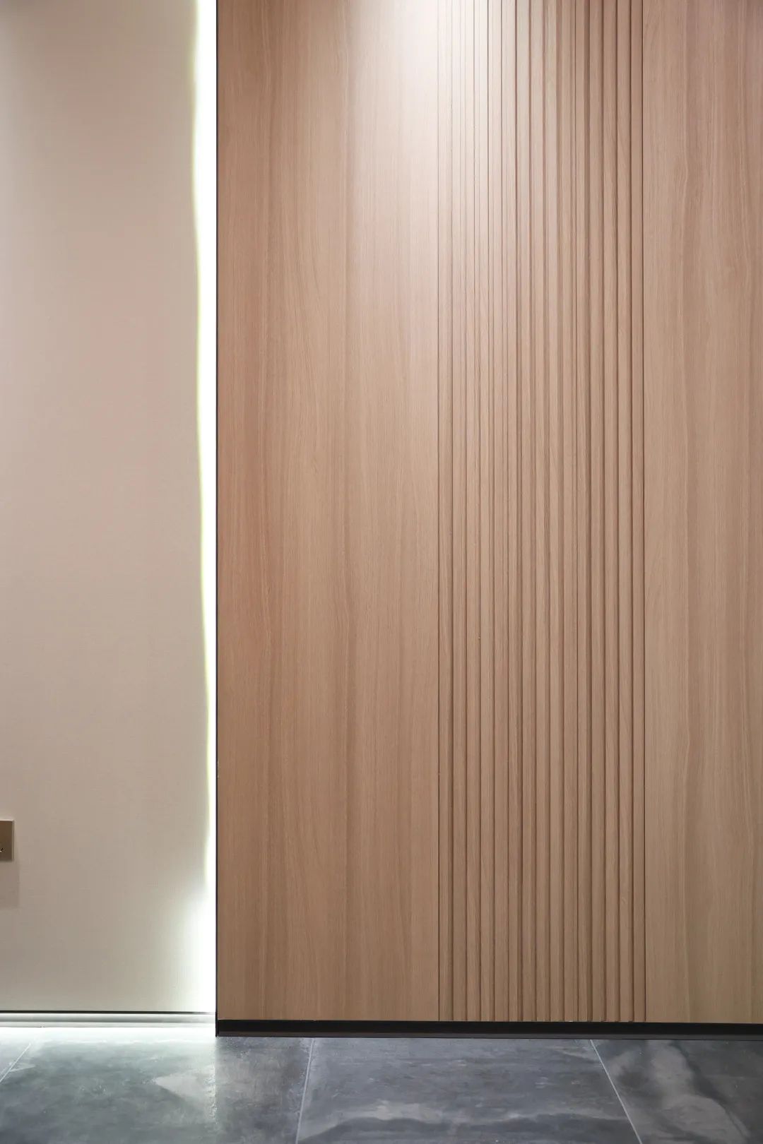 茶室墙面:布纹+木纹平面护墙板+木纹长城造型板