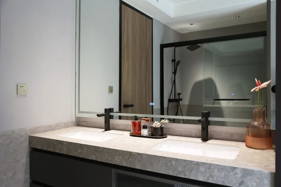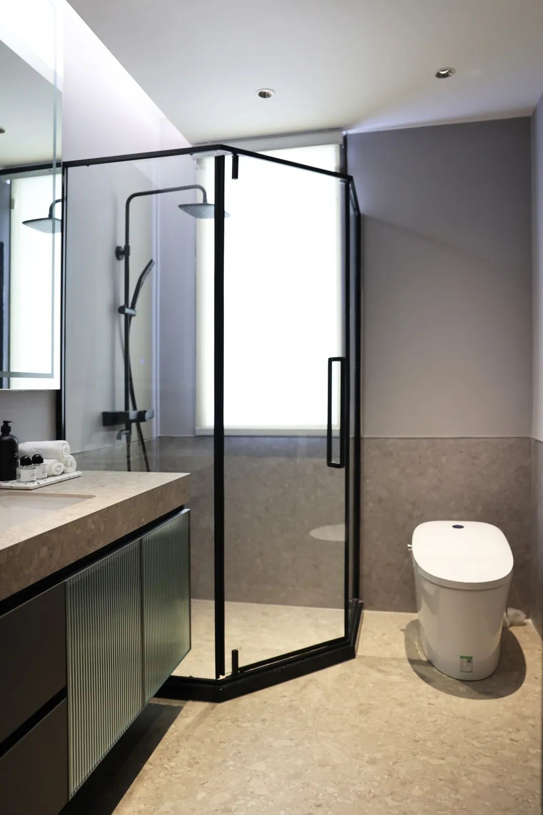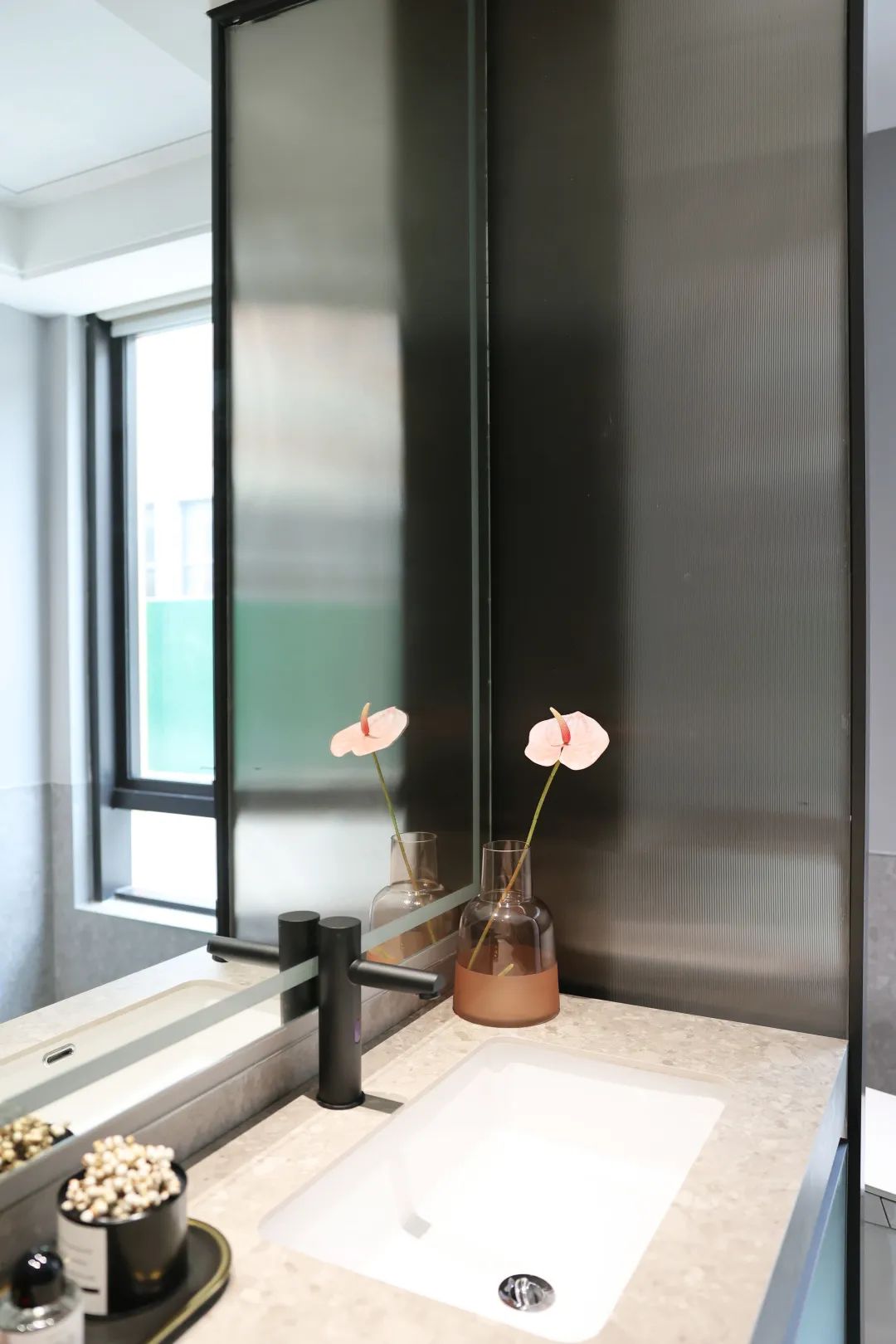 客卫采用极简边框玻璃门做隔断,实现干湿分离的同时也尽可能地保证卫生间内部的光线。