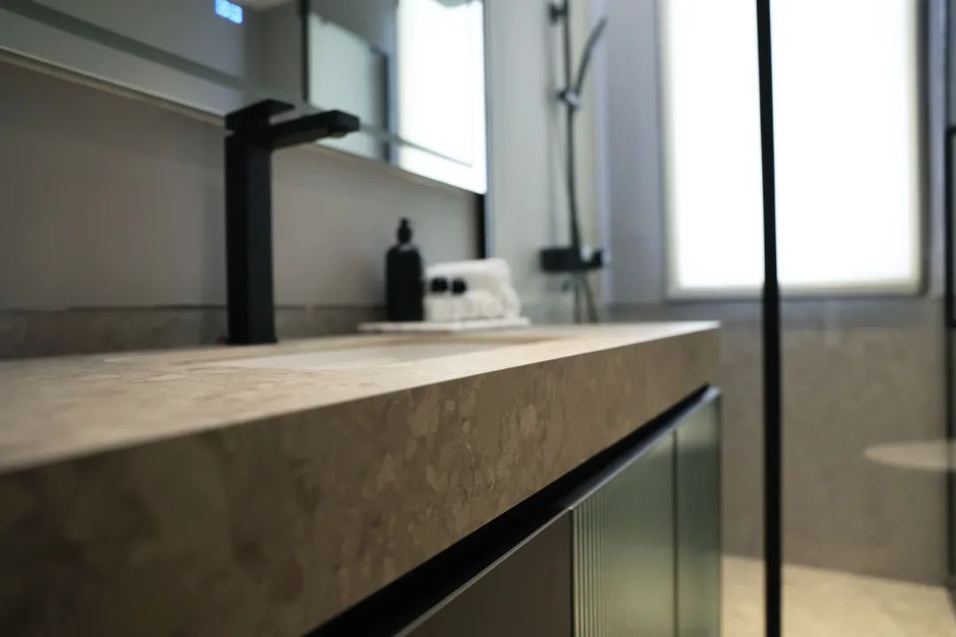 主卫台盆与墙砖使用同款产品,整体和谐统一。双台盆的设计满足高峰时段的使用,互不干扰;抽屉式的台盆柜更方便收纳和使用。
