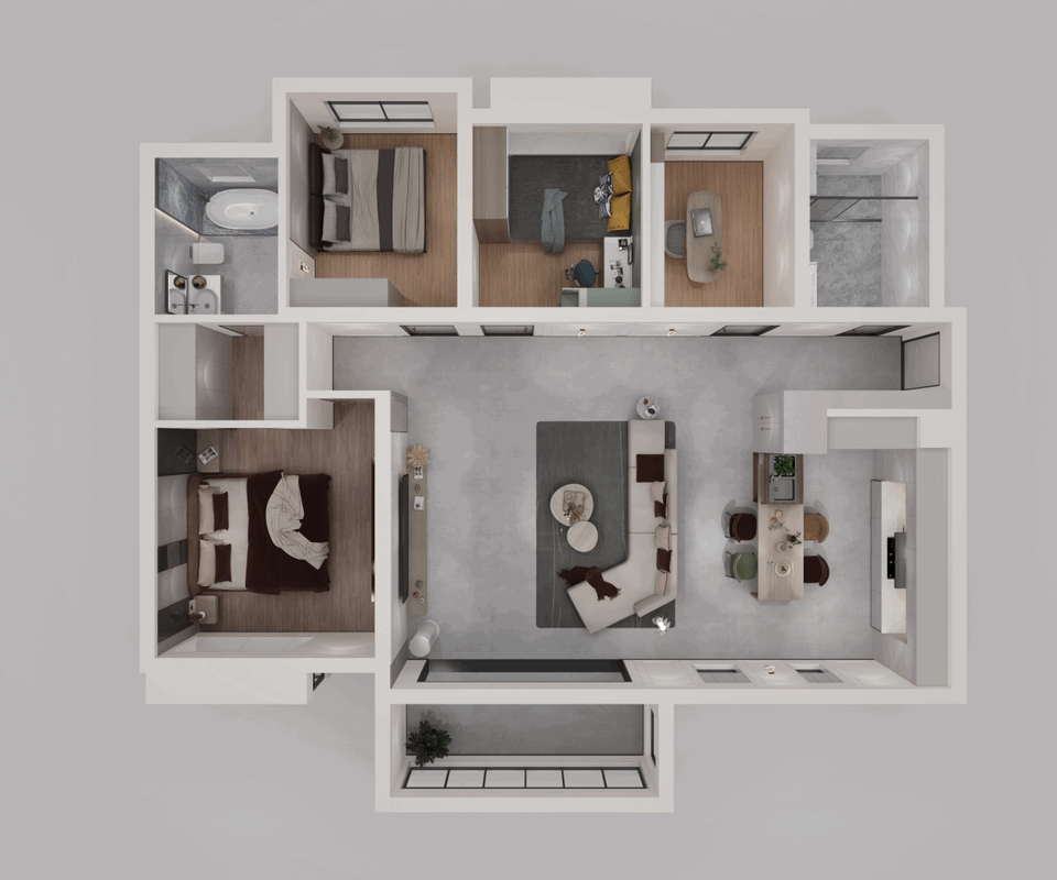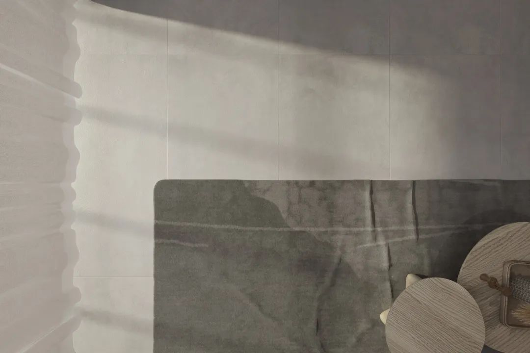 客厅地面采用和系列—清水水泥地砖通铺,选择同色系美缝,打造水泥自流平的自然效果。