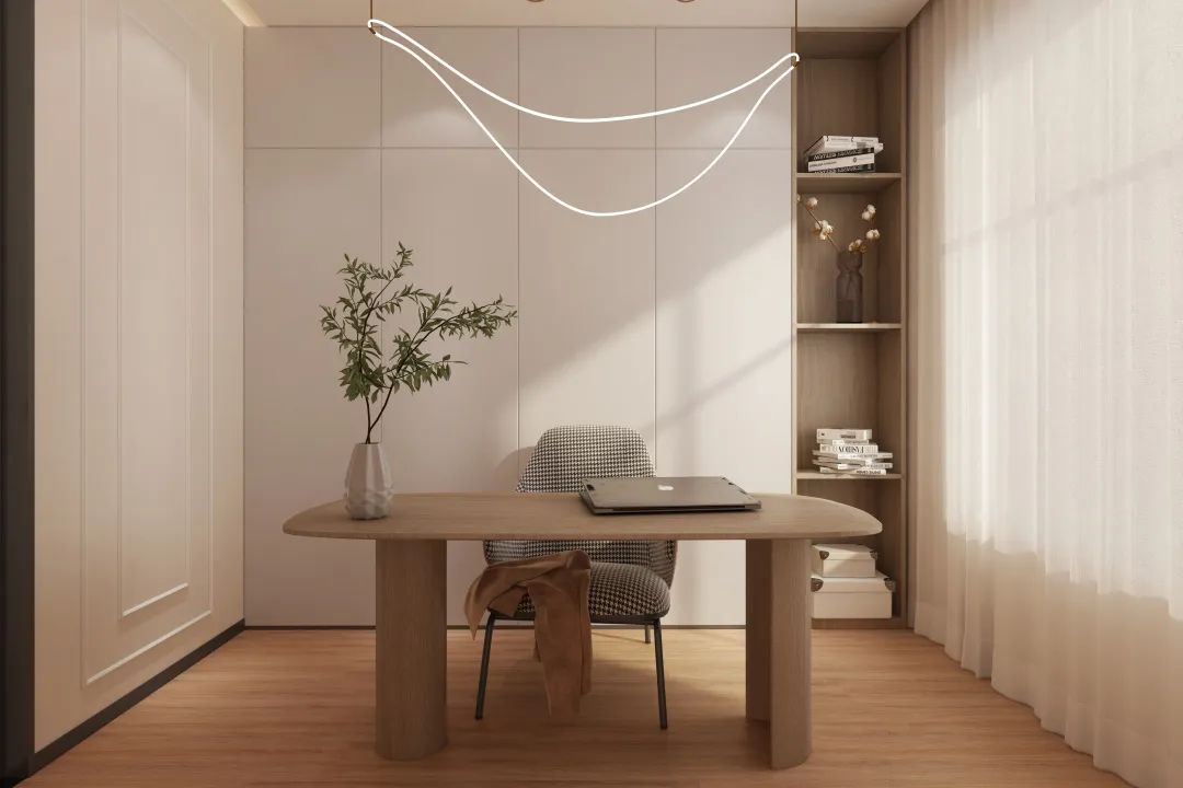 书房采用浅灰+木纹整面柜体,做部分开放格方便随手拿放杂物,造型圆润的原木弧形