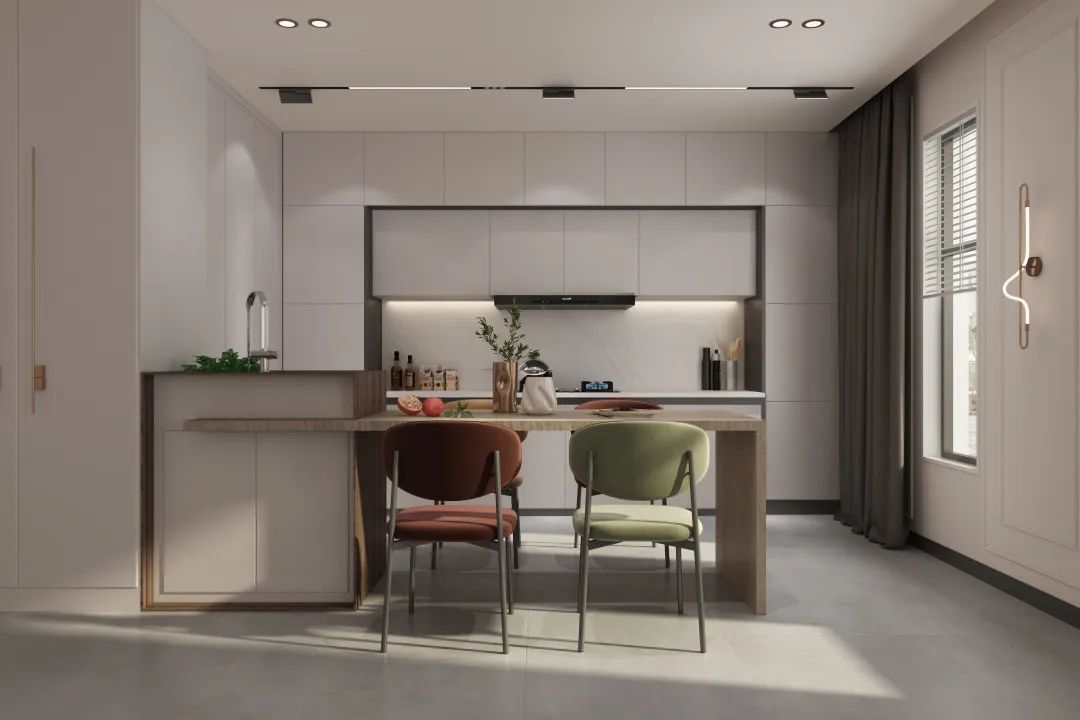 开放式厨房+岛台餐桌的搭配,视野开阔,空间利用率高,连接玄关做整面柜体,极大增加收纳空间。跳色餐椅点亮,墙面做极简石膏线搭配精致黄铜壁灯,墙漆选用奶油色,极简中透露一丝奶呼呼的轻奢浪漫。
