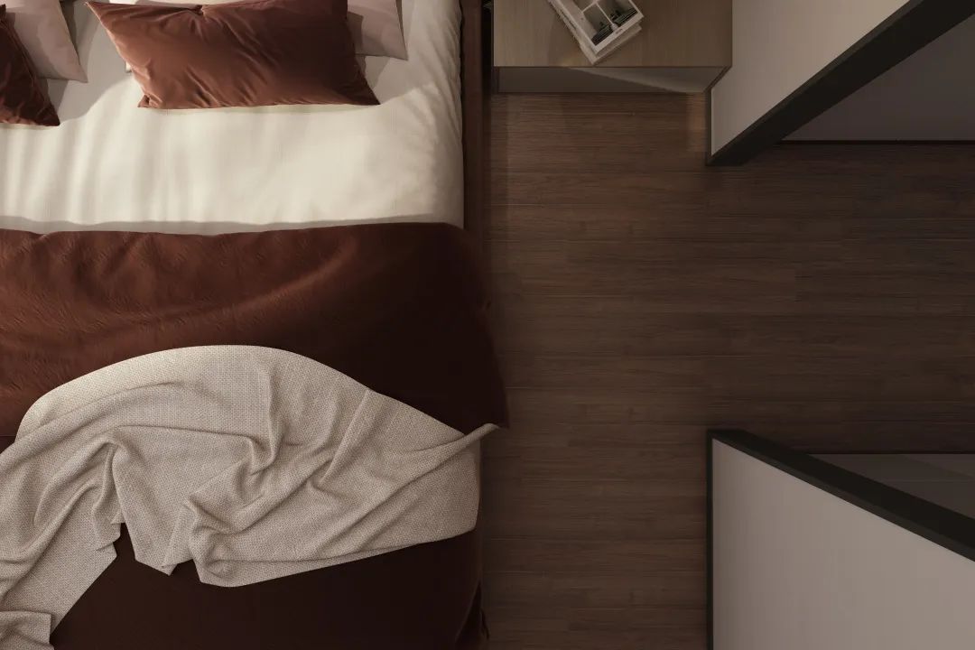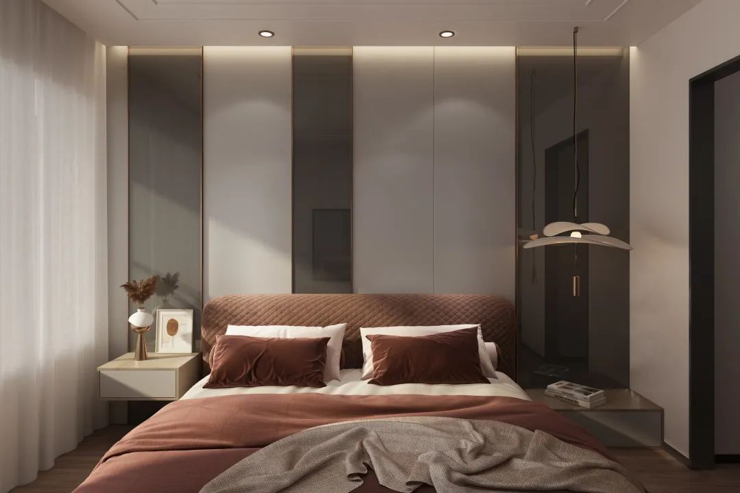 灰色墙板与黑色镜面结合,搭配橙红色床品,精致又时尚。高低床头柜设计,满足