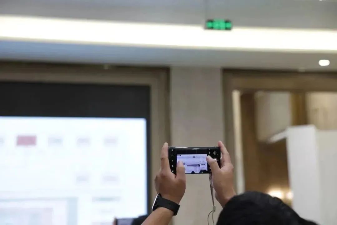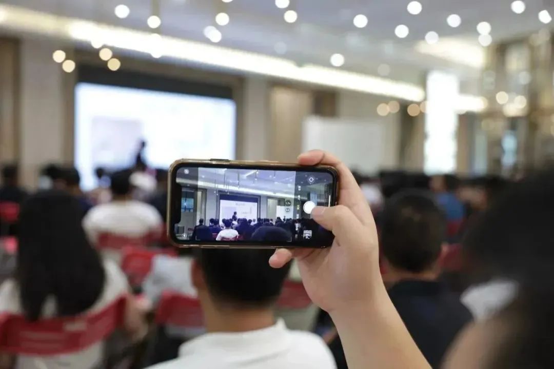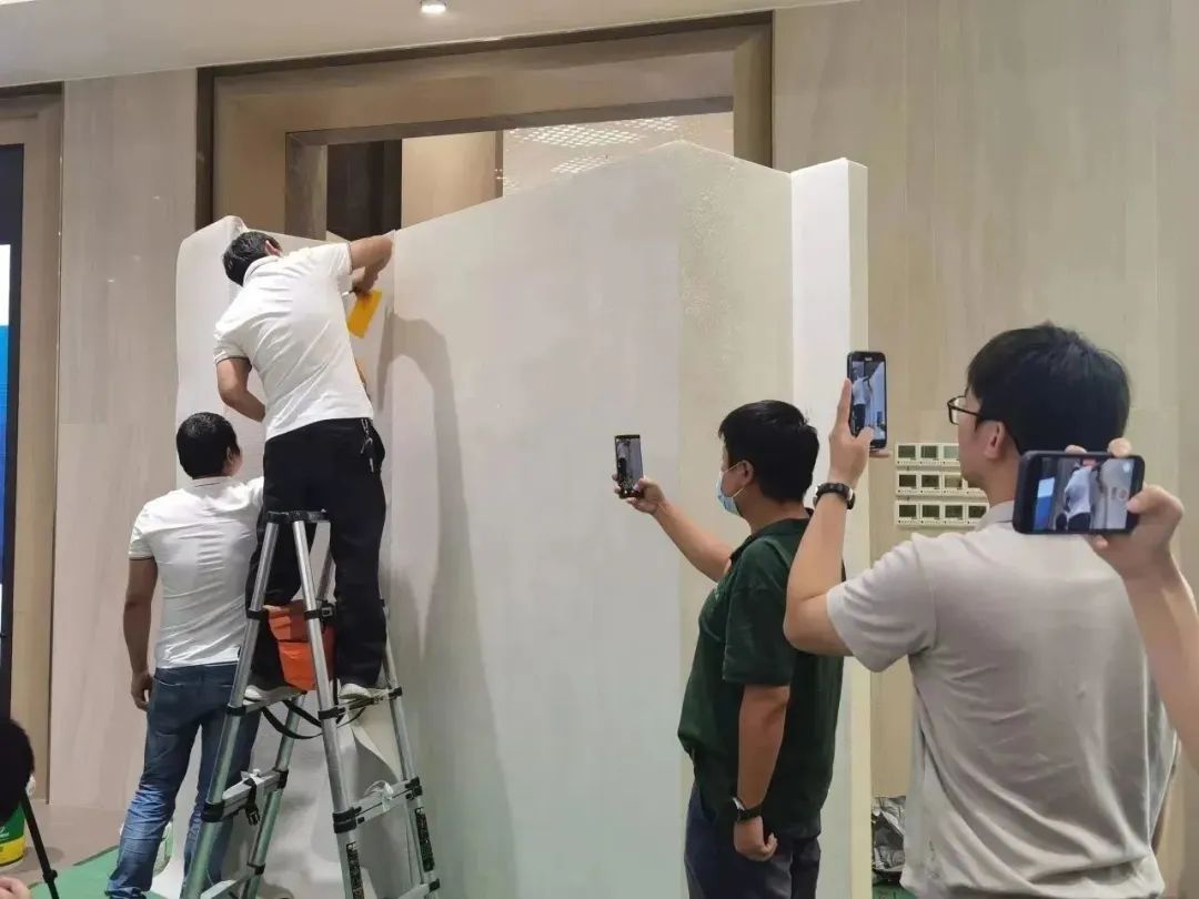 大家纷纷拿起手机上前拍摄与学习,深度了解产品应用以及施工方式,为接下来对鹰牌集团质感墙衣的销售与推广做好充分的知识储备和服务意识。
