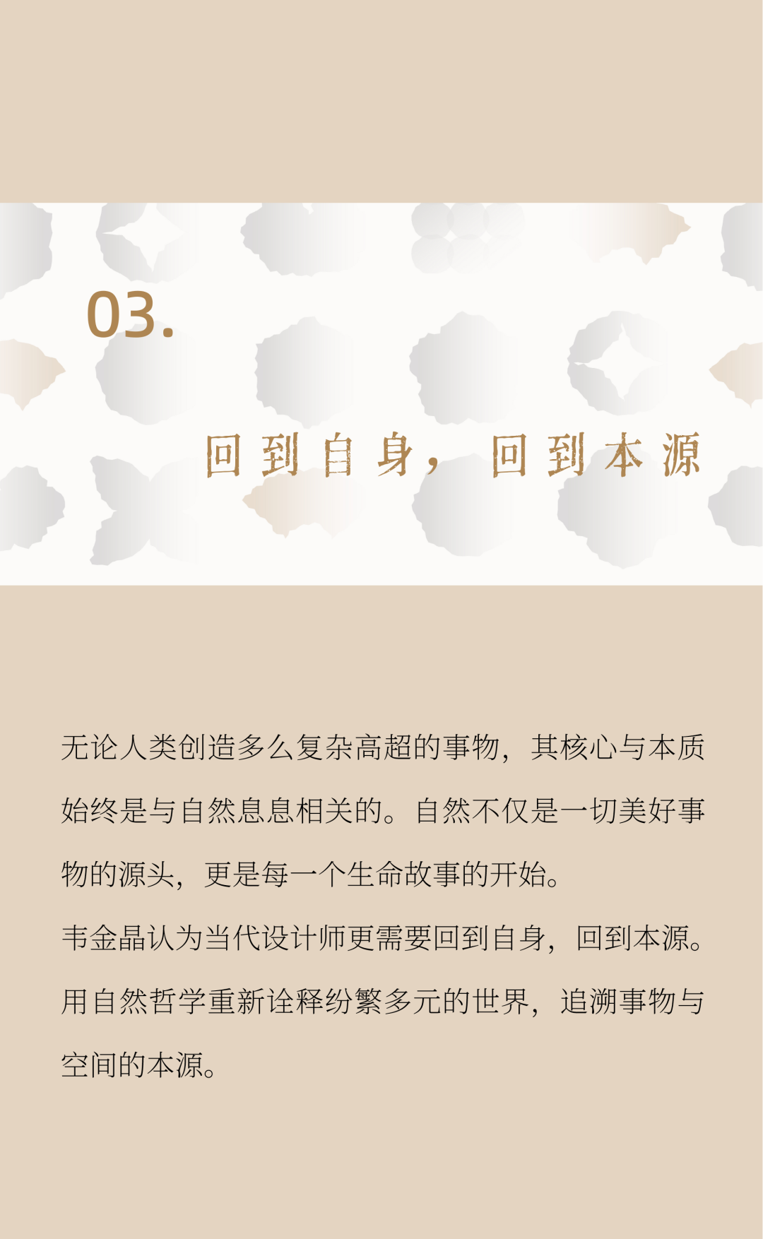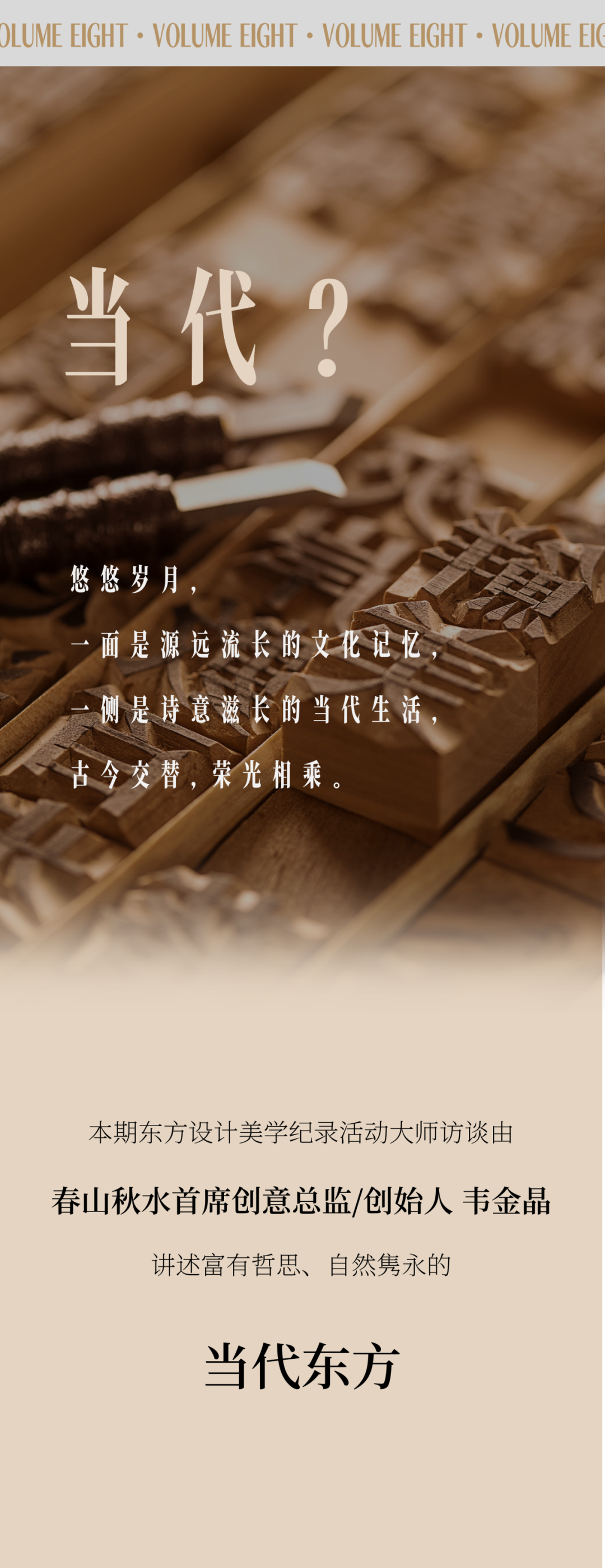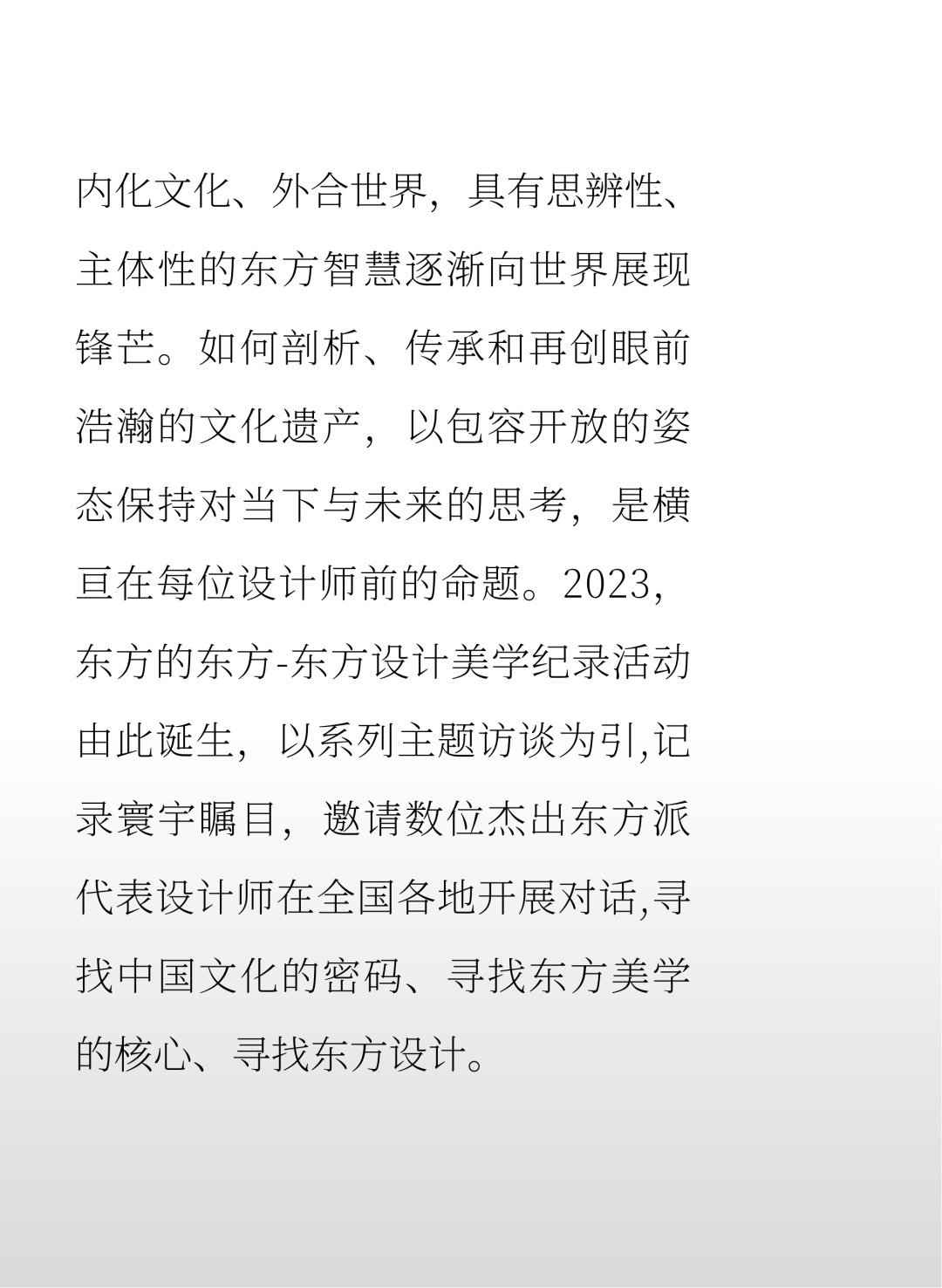 新的东方创作语境下,当流变的现代与科技生活奔涌来时,我们能做的是重新构建设计与艺术的生命能量场。在此背景下,广州设计周发起“东方的东方”-东方设计美学记录活动,将视野聚焦于发现东方、探索东方、感受东方、呈现东方四大板块,基于继承当代东方生活方式,海纳东方美学设计这一底层逻辑,以主题访谈、设计竞赛、设计策展、会议论坛、主题研学、书刊出版等不同形式的内容版块构建年度运营体系。集结与歌颂东方美学杰出创作,去生发内容、记录范式!