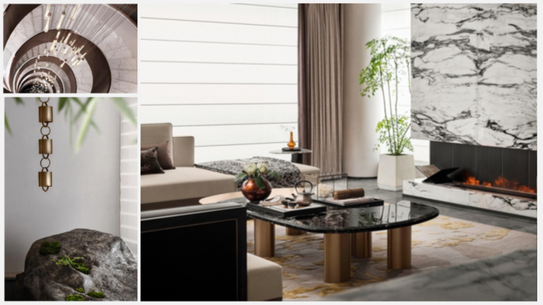 轻纱被风吹成金色的云烟,恰如线性石纹舞动成生动的自然画卷,时而轻盈飘逸,时而汇聚成团,像天边散落的霞光,赋予空间诗意与浪漫。