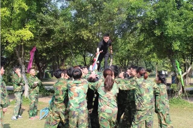 所谓信任背摔,就是一个队的队员依次从高台背向笔直倒下,由另外一个队的队员用身体作为保护,去接住倒下的队员。