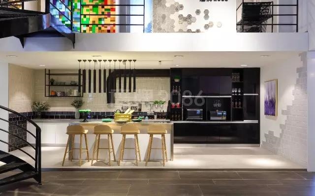 复古工业风:整个空间由灰色、土黄色和白色三种颜色填充。水泥质感现代仿古砖地板,木纹现代仿古砖铺贴的墙面与木纹天花,工业风厚重,现代设计感强烈的橱柜和桌椅,使得厨房饱含设计感。